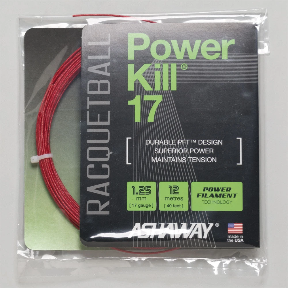 The Ashaway PowerKill® 17 racquetball string combines durability and strength to give players more of what they want. The Zyex filaments help maintain string tension and provide explosive power with every shot. Due to its enhanced durability, the PTF™ design is geared toward players with varying levels of power and who may break strings more frequently.