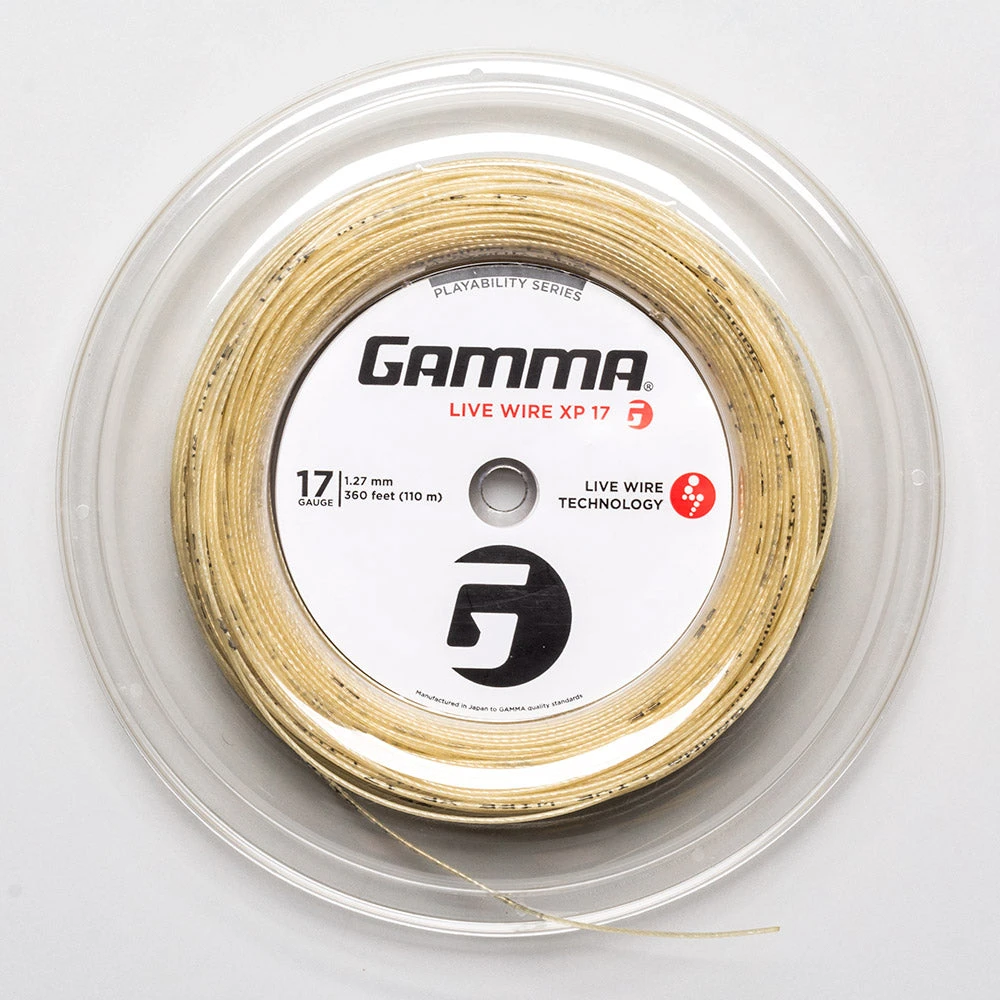 Multifilament Synthetics. The Gamma Live Wire XP 17 360′ reel is a multifilament string consisting of Multiwrap Live Wire monofibers and Zyex monofilaments with Pearl Coating. Offers a firmer crisp feel for natural gut-like playability. Zyex monofilaments added to the outerwrap provide added durability and help reduce tension loss.