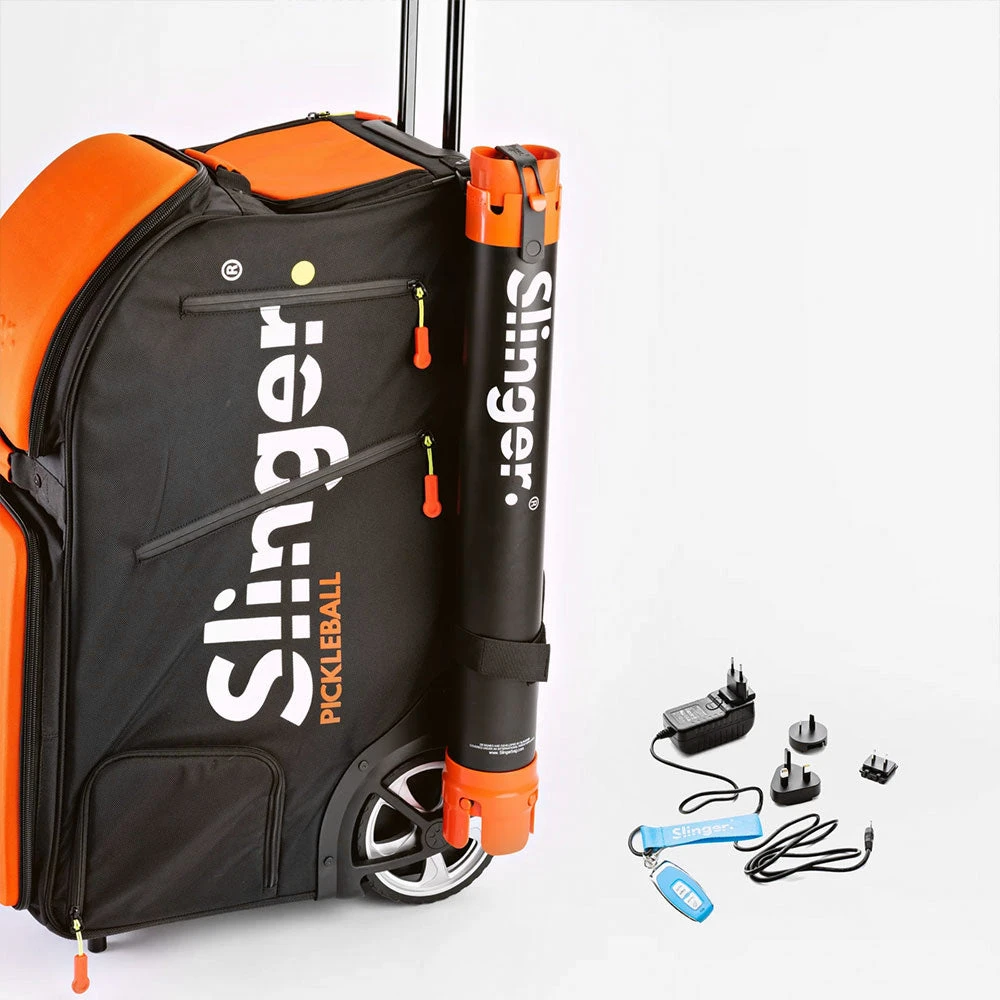 - Slam pack includes the Slinger Pickleball Launcher, remote control, oscillator, ball tube, camera holder, lithium-ion battery and charger