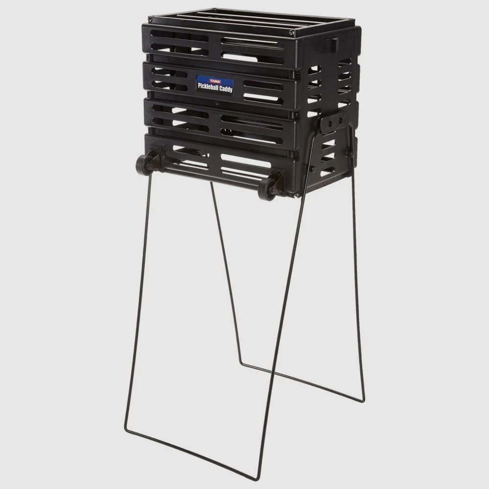 The Tourna Pickleball Ballport Deluxe with Wheels is built to hold more than 46 pickleballs. Its constructed with tough polypropylene that is lightweight and wont rust. Flip up the handles to pick up balls and flip them down to feed balls.