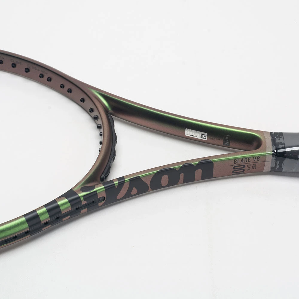 The Wilson Blade 100 v8 gives competitive players a signature feel and an excellent blend of dynamic design, power and control. Equipped with all-new FORTYFIVE, a patent-protected carbon construction, this racquet adds a few degrees of flexibility and stability from its previous version to create a superior feel at contact. Boasting a slightly thicker beam than other Blade models, the Wilson Blade 100 v8 for boosts power with a unique color-shifting elastic finish between shades of green and copper.